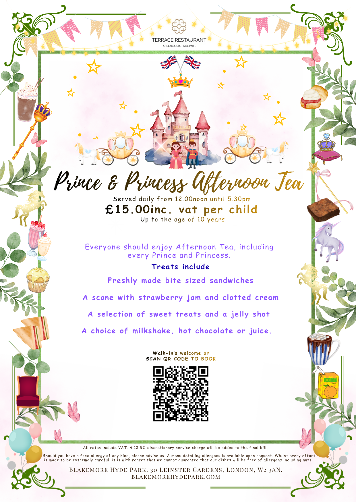 Take time to relax and enjoy a quintessentially British tradition, the Afternoon Tea; consisting of a selection of freshly made finger sandwiches, warm scones with Clotted Cream & Jam followed by a tasty selection of sweet treats. Choose from our Kings Guard, Prosecco or Traditional. We also believe that everyone should enjoy Afternoon Tea, not just grown ups! For children we offer the Little Prince/Princess Afternoon Tea.