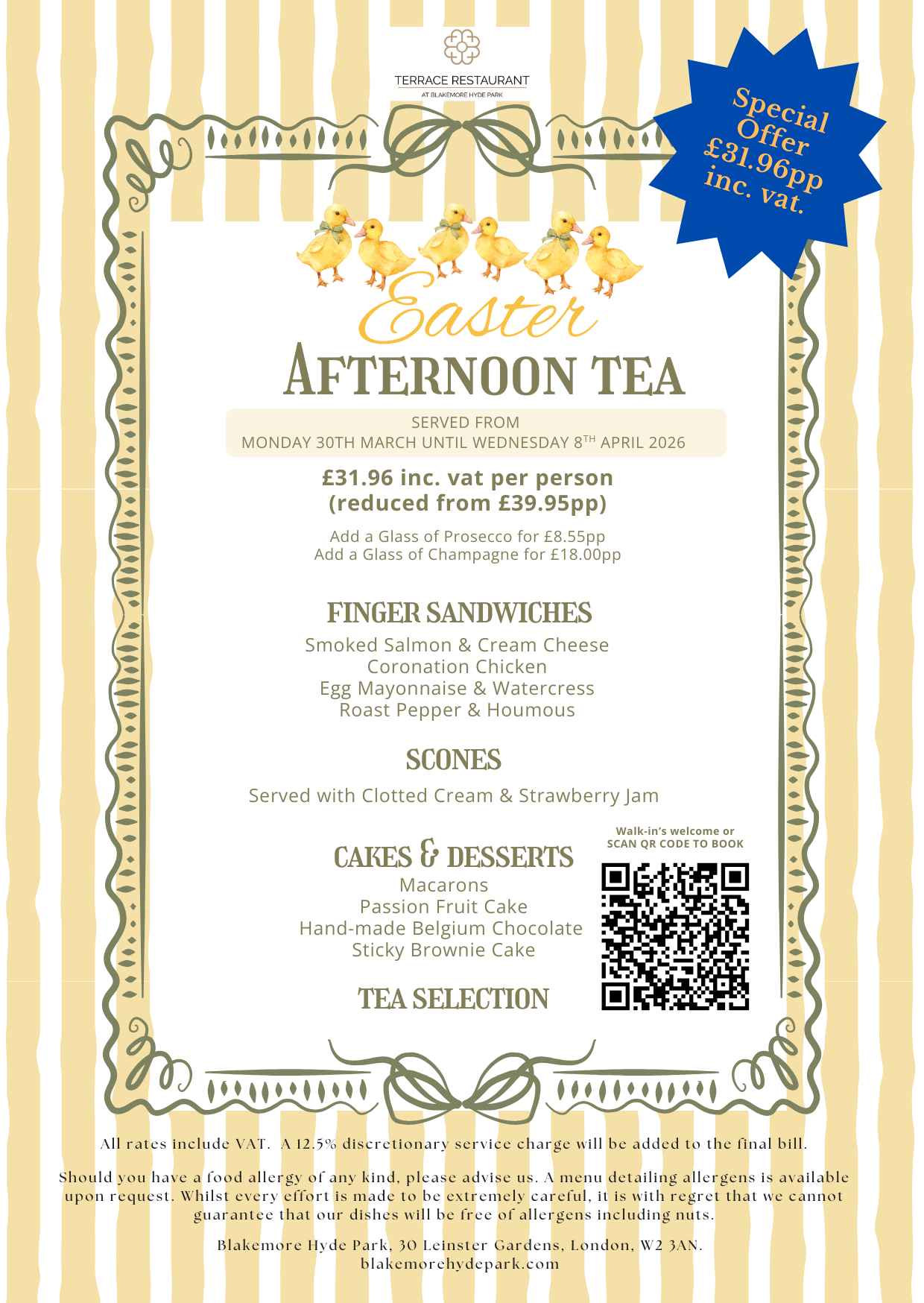 Look out for our seasonal Afternoon Teas such as Valentine’s, Mother’s Day, Easter, Chelsea Flower Show, Wimbledon, Halloween, and Christmas.